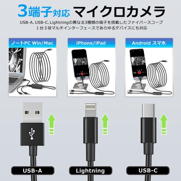 ファイバースコープ HD 内視鏡カメラ USB-A/C Lightning 3接続 5.5mm 高画素 極細レンズ LED ライト 調光 形状記憶ケーブル スマホ PC iPhone iPad iOS Android