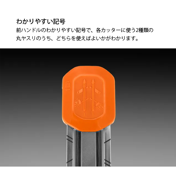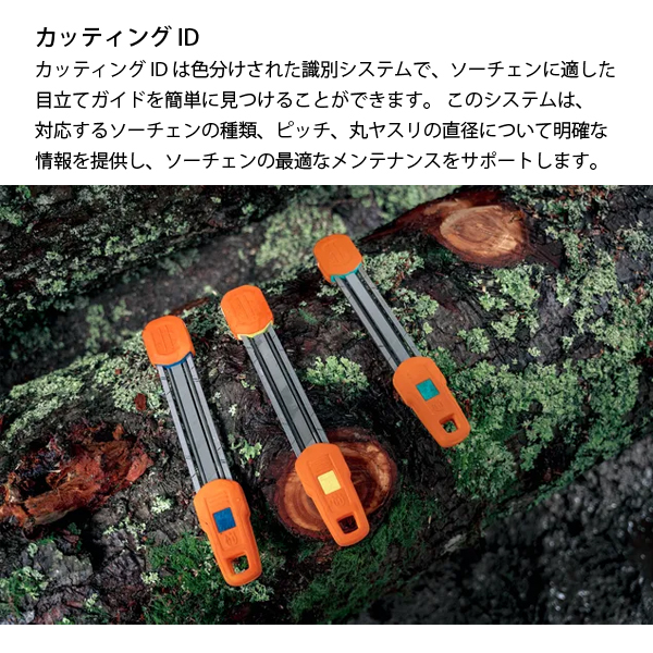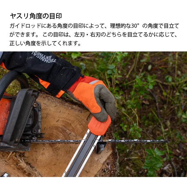 ピッチごとに色分けされたガイドと、ヤスリ角度の目印により、目立て作業は非常にスムーズかつ簡単に行えます。作業は一方向にヤスリを動かすだけで済み、初心者でも扱いやすい設計です。