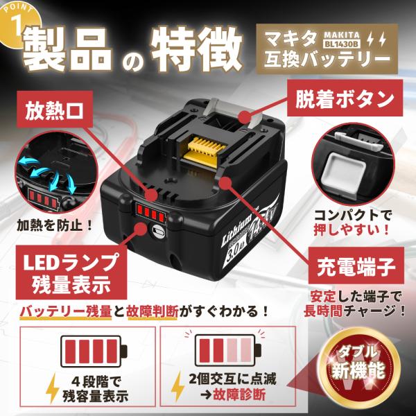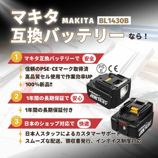 マキタ 互換品 makita バッテリー BL1430B 14.4V 3.0Ah ハイパワー 電動工具 工具 BL1420 BL1420B BL1430 BL1450 BL1450B BL1460 BL1460B 対応 (BL1430B/2個)
