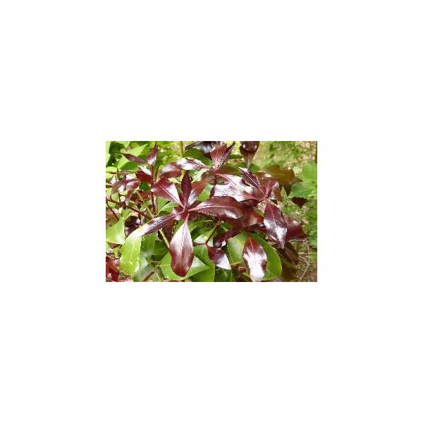 シキミ 黒香 :新芽が黒葉になり、展開時には樹全体が真っ黒になる圧巻の姿である。また黒から緑色に変化する際に、斑入り葉として残る場合もあるようです。