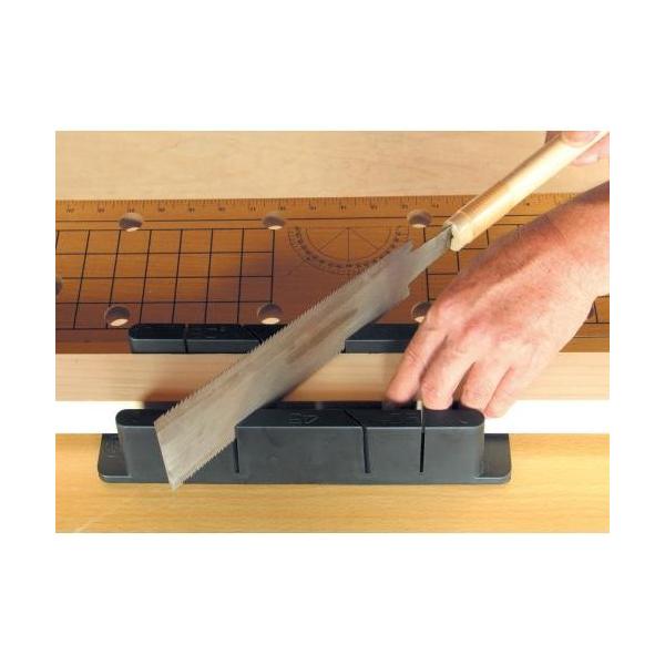 額縁・パネルなどのコーナー切り、ホビー、工作に!溝に合わせて切るだけだから簡単!45°90°の溝がきってあるので、鋸の切断が簡単に正確に出来ます!作業台などにしっかり固定できるネジ穴付!ネジで本体を固定すると、確実に切断できます。プラスチック製なので、刃物を傷めません!