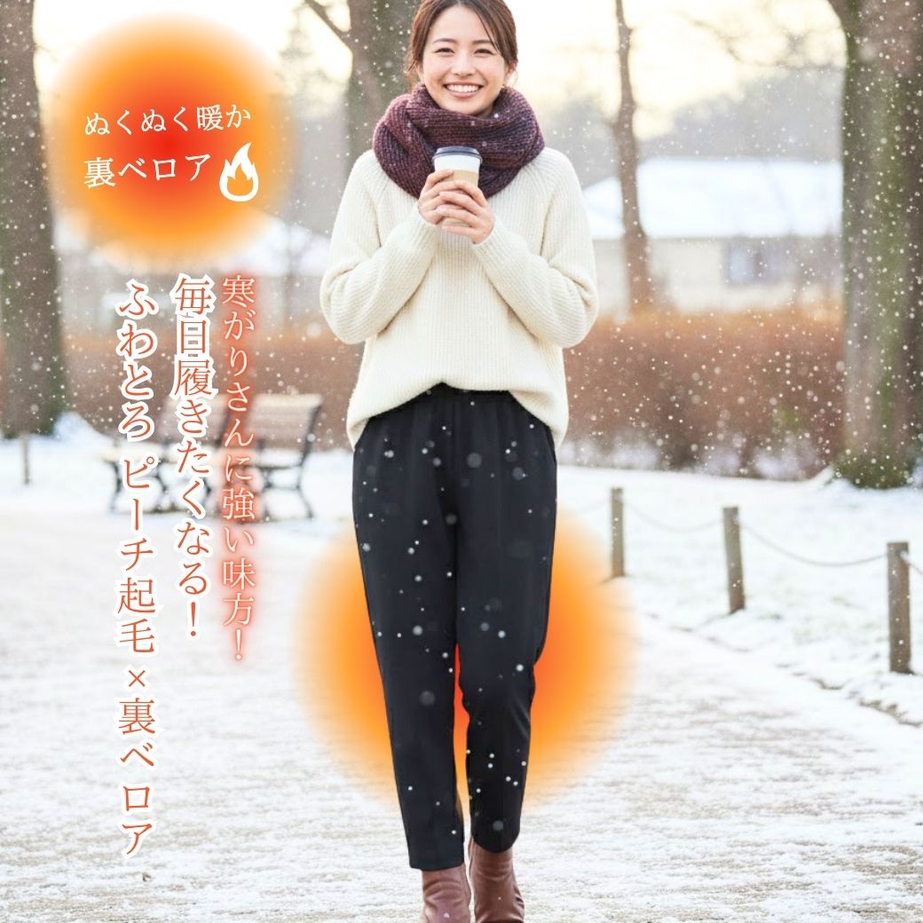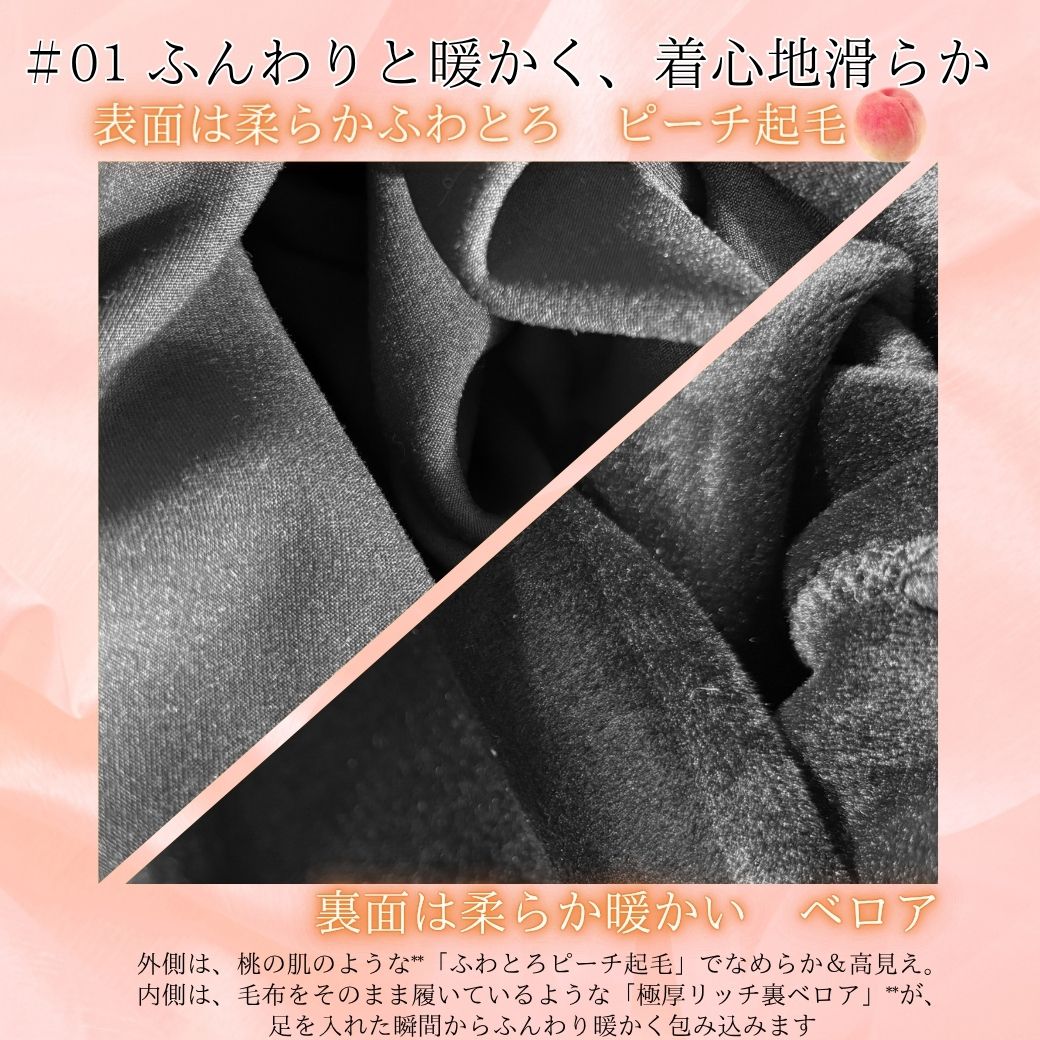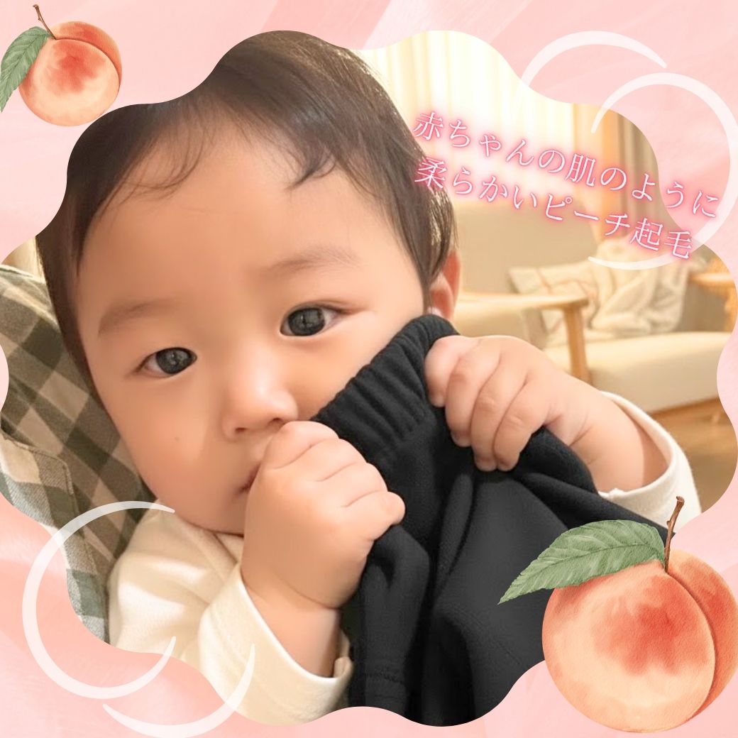 暖かさの秘密:ふわとろピーチ起毛 $\times$ 極厚裏ベロア表面:ふわとろピーチ起毛桃の肌のような柔らかな肌触りが特徴。