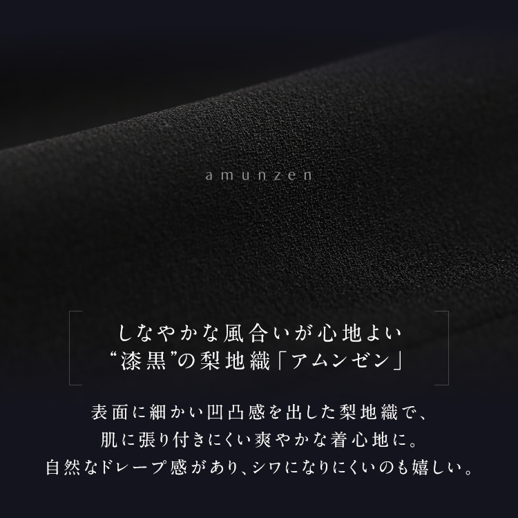 表面に細かい凹凸感を出した梨地織で、肌に張り付きにくい爽やかな着心地に。自然なドレープ感があり、シワになりにくいのも嬉しい。