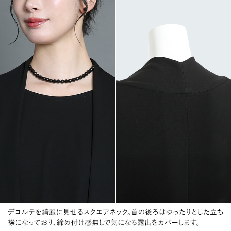 ・デコルテを綺麗に見せるスクエアネック。首の後ろはゆったりとした立ち襟になっており、締め付け感無しで気になる露出をカバーします。