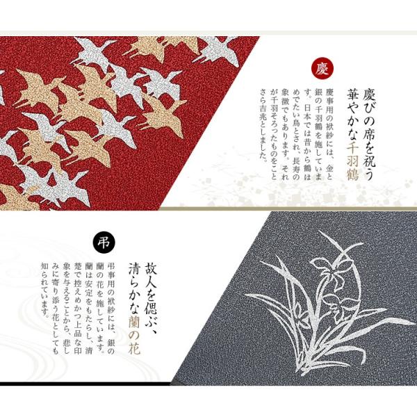 慶事には千羽鶴が施されたエンジ、弔事の際には清らかな蘭の花を施したグレーと使い分けていただくことができます。