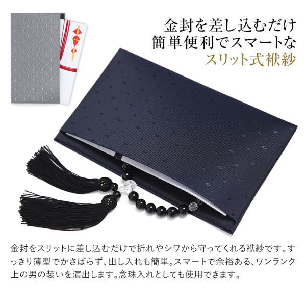 ・金封をスリットに差し込むだけで折れやシワから守ってくれる袱紗です。すっきり薄型でかさばらず、出し入れも簡単。スマートで余裕ある、ワンランク上の男の装いを演出します。念珠入れとしても使用できます。