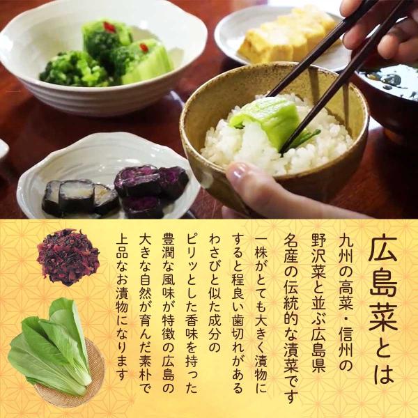 広島菜は、九州の高菜、信州の野沢菜と並ぶ三大漬菜の一つで、 広島県名産の伝統的な漬菜です。一株がとても大きく堂々たる風格で、漬物に加工すると程良い歯切れがあり、わさびと似た成分のピリッとした香味を持つ豊潤な風味が特徴です。広島の大きな自然が育んだ、素朴で上品なお漬け物です。