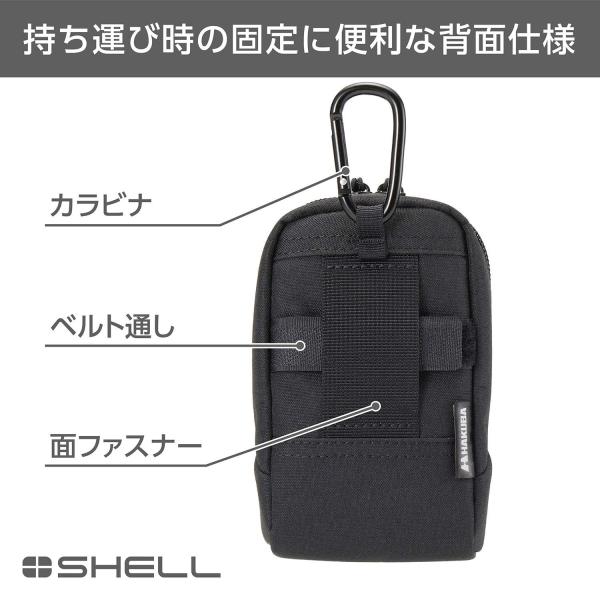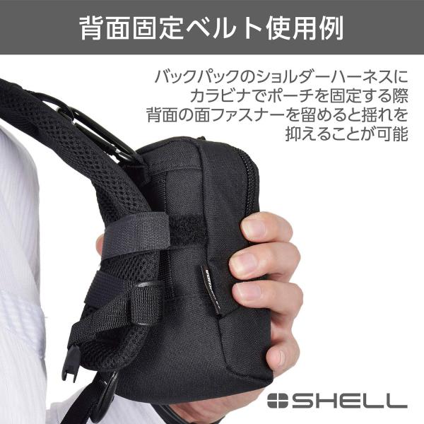 背面にはカラビナ、ベルト通し、面ファスナーを備え、様々な方法で固定できます。