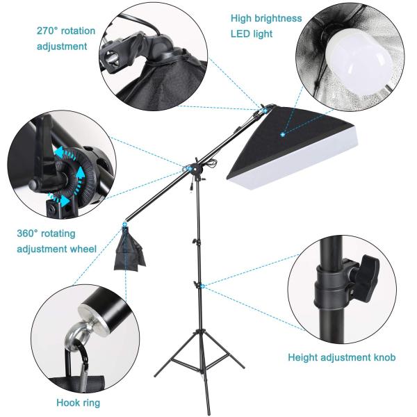 【キット内容】50*70cmソフトボックスx3、70-200cm三脚ライトスタンドx3、58W LED電球x4、76-140cmブームアームx1、サンドバッグx1、キャリングバッグx1