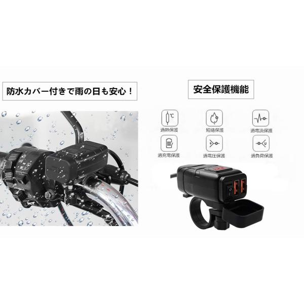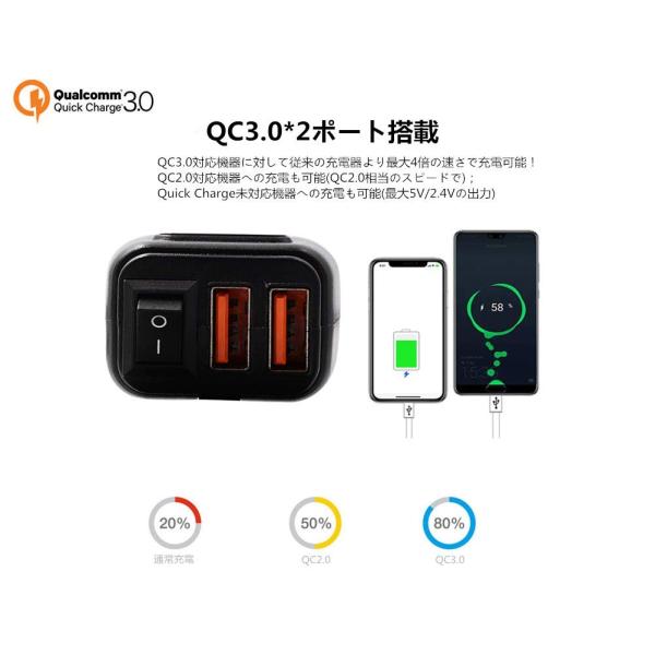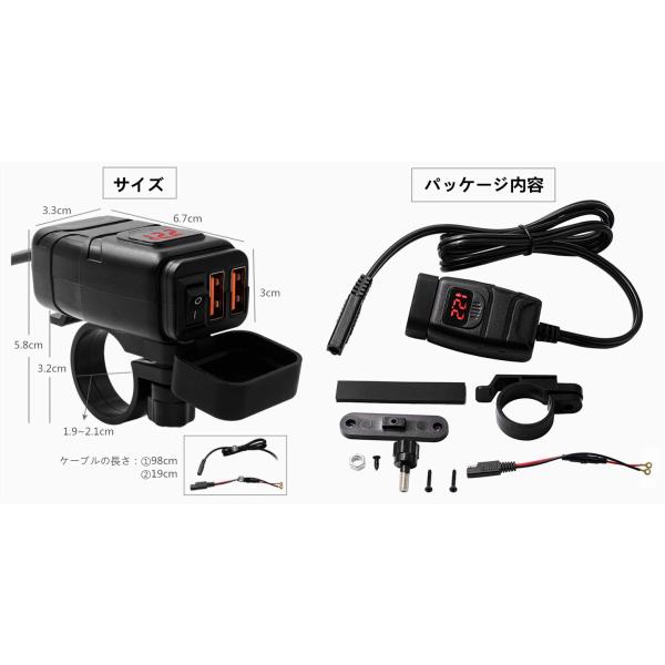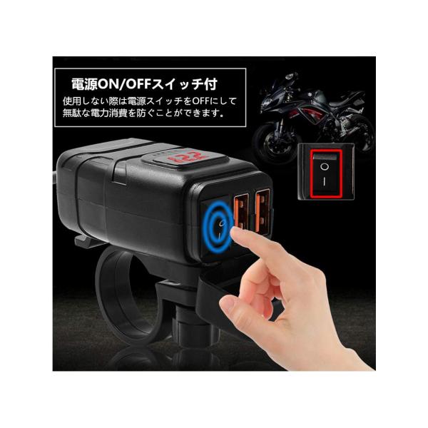 SHEAWA バイク USB電源 USB充電器 QC3.0 USB2ポート 電圧計 防水カバー 電源ON/OFFスイッチ Quick Charge 3