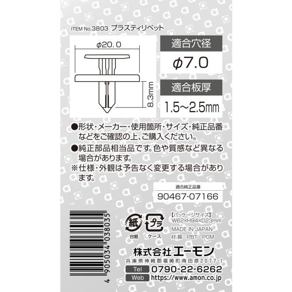 商品名:エーモン(amon) プラスティリベット (トヨタ車用) タイヤハウス・リアバンパーアンダー用 5個入 カーファスナー クリップ 内張りピン 3803