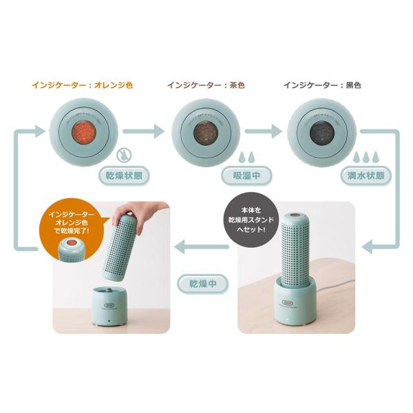 【繰り返し使える!】 インジケーターの色で吸湿の状態がわかります。 本体には吸湿剤を内蔵。吸湿力が落ちたら、付属の専用乾燥用スタンドで約2時間乾燥させると、またすぐに除湿が再開できます。 水・ゴミ捨て不要で、繰り返し使えてエコ。 インジケーターの色で吸湿の状態が一目で分かる使いやすさもポイントです。