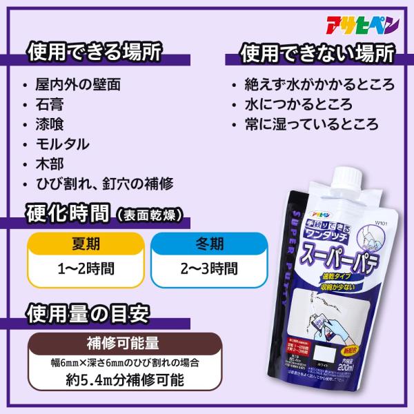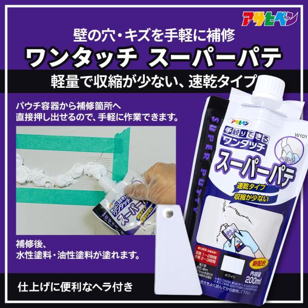 商品名:アサヒペン パテ ワンタッチ スーパーパテ 200ml W101 ホワイト 手絞りパウチ ヘラ付き 壁用 速乾 軽量 補修 日本製