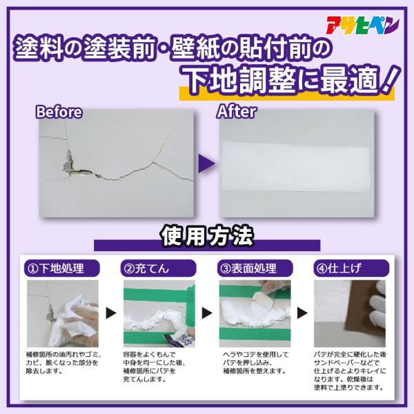 用途:屋内外の壁面(石膏、漆喰、モルタル、木部)などのひび割れ・釘穴の補修に。※絶えず水がかかったり水につかるところや、いつも湿っているところには適しません。