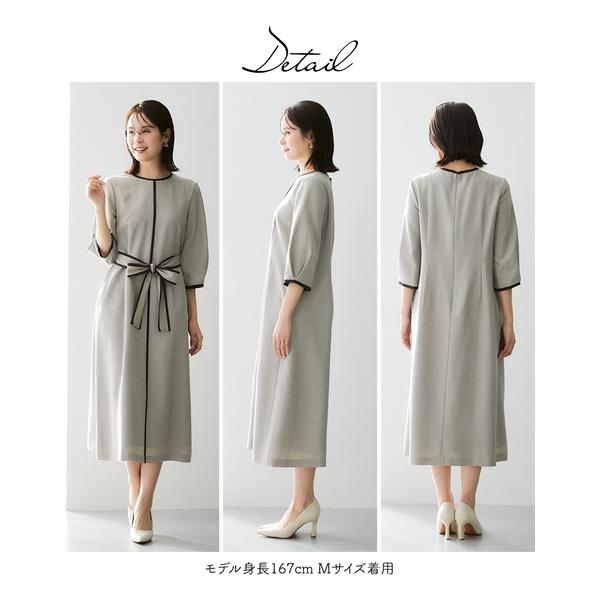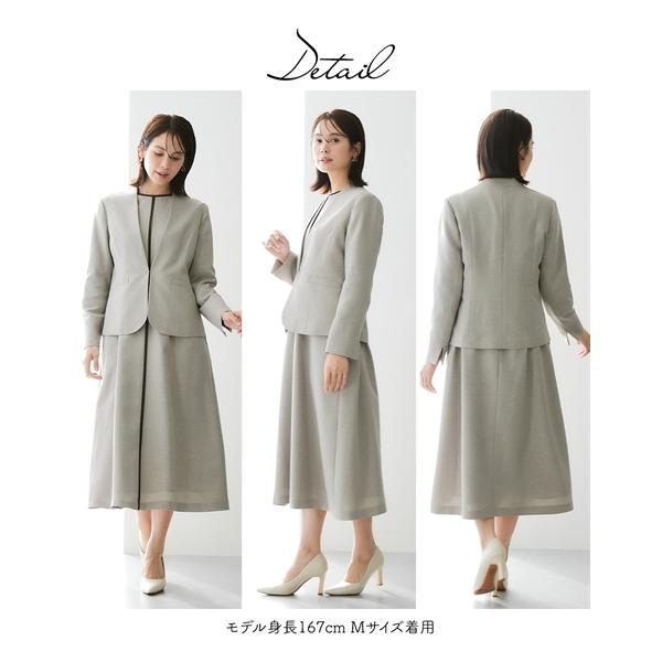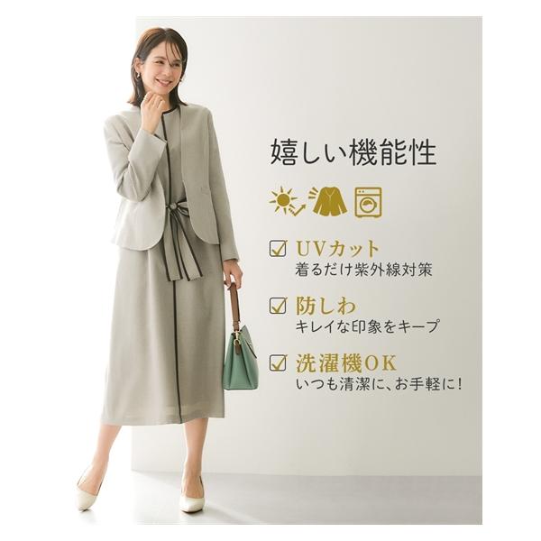 スーツ レディース 配色パイピング使いアンサンブル ノーカラー ジャケット +共布 ベルト付 ロング丈フレア ワンピース 春 秋 | S/M/L | ニッセン nissen