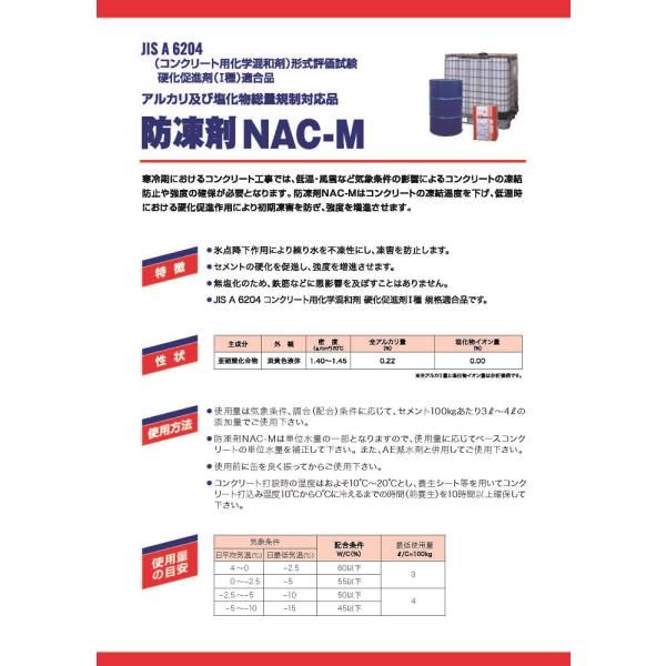 マノール防凍剤NAC-Mは、JIS A 6204「コンクリート用化学混和剤」形式評価試験 硬化促進剤(I種)適合品の液体防凍剤です。