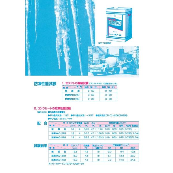 マノール防凍剤NACは、寒冷期のモルタル・コンクリート工事、左官工事、吹付工事に使用して初期凍害を防止する完全無塩化・無アルカリタイプの防凍剤です。