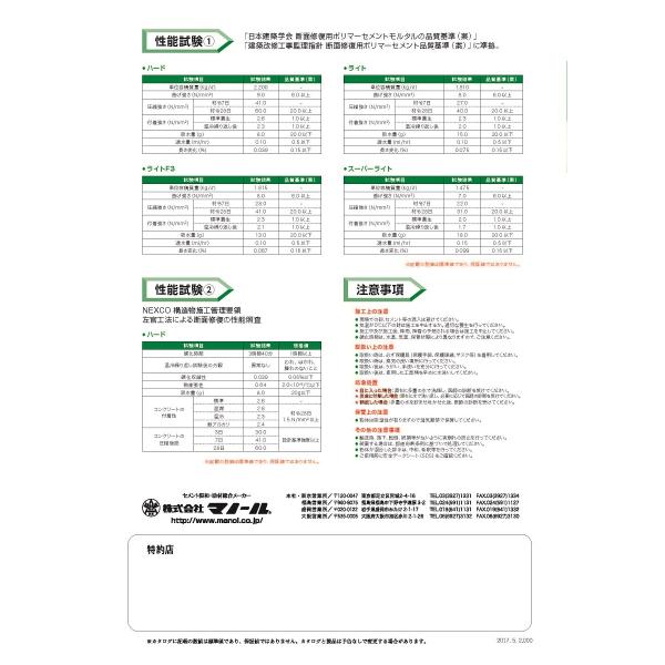 5.「日本建築学会 断面修復用ポリマーセメントモルタルの品質基準(案)」、「建築改修工事監理指針 断面修復用ポリマーセメント品質基準(案)」の物性を有しています。(株式会社マノール社内試験)