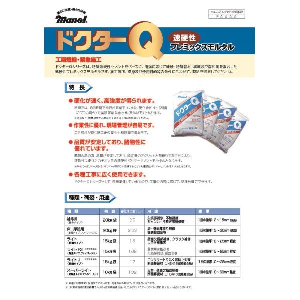 ドクターQは、特殊速硬性セメントをベースに、用途に応じて珪砂・特殊骨材・繊維および混和剤を調合した速硬性プレミックスモルタルです。混和液のマノールアクリットと混練りすることにより、強力な接着力を発揮するカチオン性の速硬性ポリマーセメントモルタルになります。