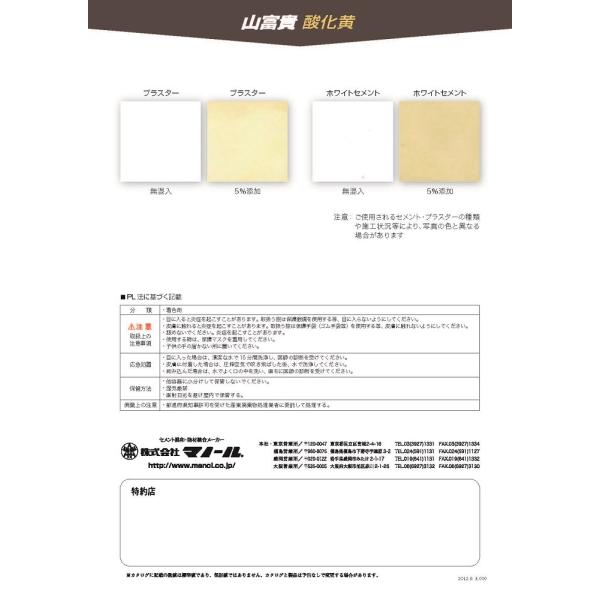 山富貴酸化黄は、酸化鉄と二酸化珪素を成分とするセメント・漆喰・プラスター用天然の黄色顔料です。