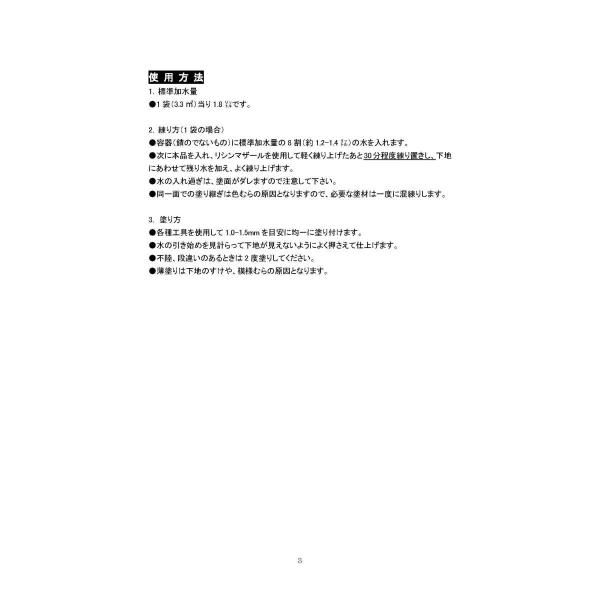 ・標準加水量(1.8/袋)の8割の水を容器(錆のでないのも)に入れてから、本品を入れリシンマザールで軽く練り上げたあと30分程度練り置きし、下地に合わせて残り水を加えてよく練り上げます。塗り継ぎは避けて下さい。