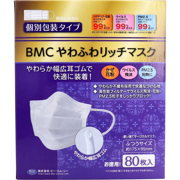 不織布マスク BMC やわふわ リッチマスク 1日 使いきり タイプ 個別包装 マスク ふつうサイズ 80枚入