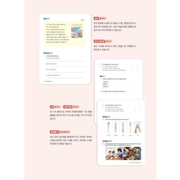韓国文化に関連する様々なテーマの読書活動を通して、読む能力だけでなく、聞き取り、話す、書くの言語機能活動で、コミュニケーション能力をさらに伸ばせます。