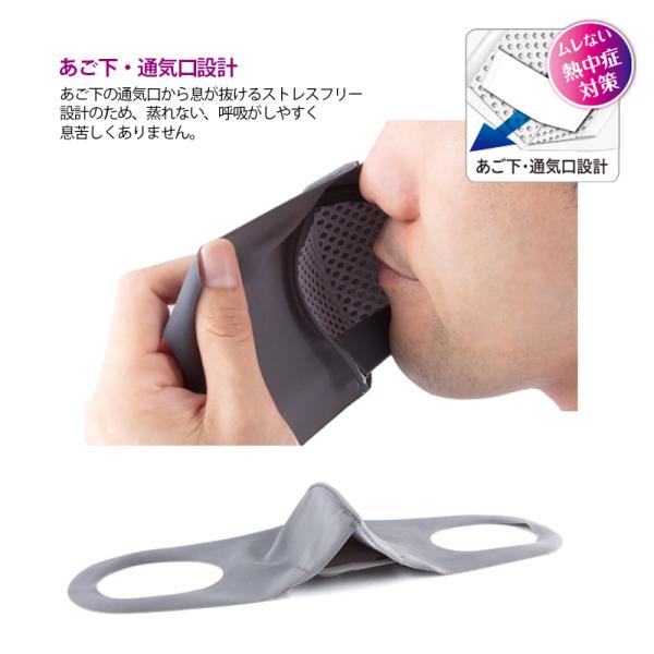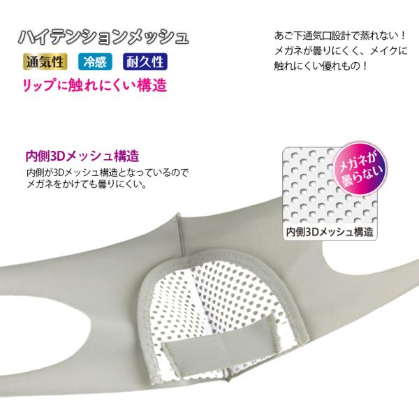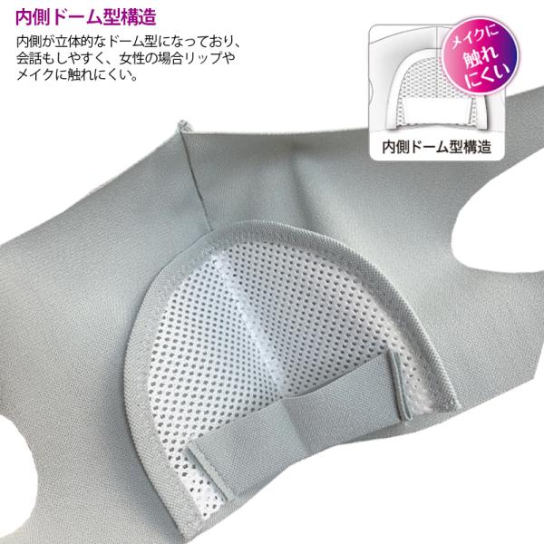 ドーム形状保持3Dメッシュ構造で激しい息呼吸でも、唇に生地が接触しにくい設計。