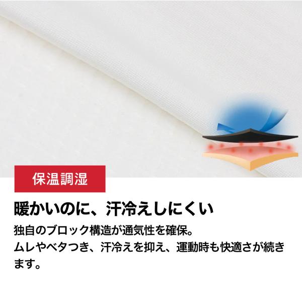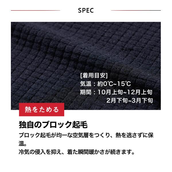 「身体に心地よくフィットするブロック起毛(通称ワッフル)の立体構造が空気層をつくり、確かな保温力を発揮。