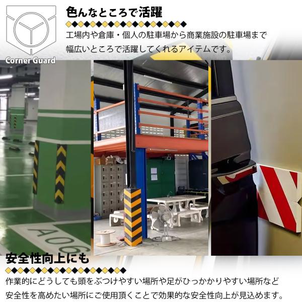 ガレージ、倉庫、駐車場、建物のコーナーなどに設置し、怪我対策や大事な車を守ります。