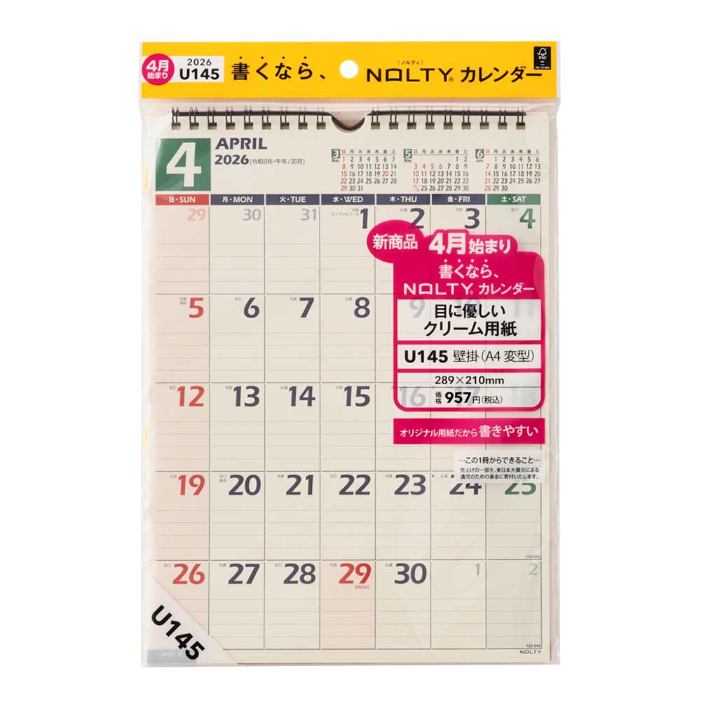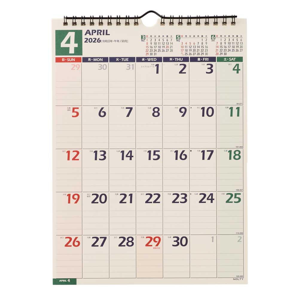 2026年4月始まり 壁掛けカレンダー NOLTY(ノルティ) A4 〈月間カレンダー〉 日曜始まり [U145]