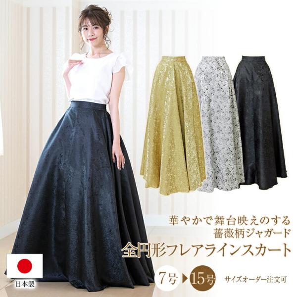 ロングスカート 演奏会 コーラス 合唱 薔薇柄ジャガード 全円形 着痩せ 黒 ゴールド シルバー 体型カバー フレアライン ステージ 衣装 フォーマル(sk3116)