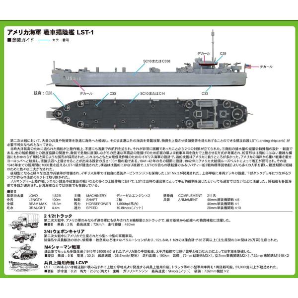 戦車揚陸艦LST-1(Landing ship,tank)は1942年から終戦まで千隻以上も建造され、ノルマンディー上陸作戦、ソロモン諸島や硫黄島の戦いなど、多くの上陸作戦において活躍しました。戦後も各国海軍で多数運用されました。