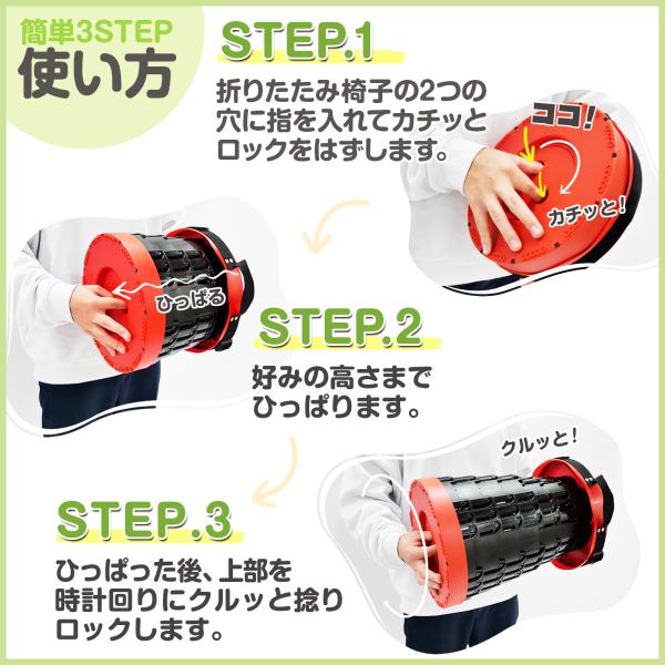 展開する後は高度43.5cmの椅子になり、更に好きな高度(9段階)を選択して回転して調節できます。
