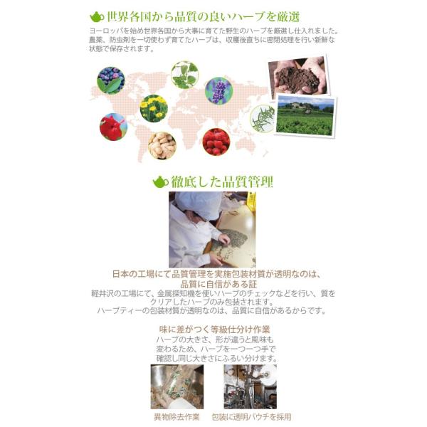 リンデンフラワー、レモングラス、パッションフラワー、オレンジピール、ローズレッド、甘草、ローズマリー、セントジョーンズワート、クローブ