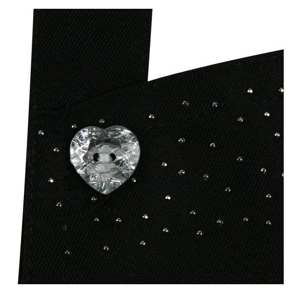 胸元とポケットにストーンをちりばめ、肩ひもをとめるボタンもハートストーンになっています。
