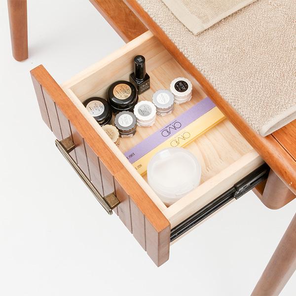 サロンで使用しやすいサイズ感で、テーブル下には小物を収納できる引き出しが2つ、中央にはライトを置くスペースと直径5cmの電源コード通し穴を設置しています。お客様側には携帯電話やティーカップなどを置ける「おもてなしスペース」も!