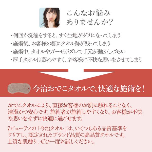 アイリストの手とお客様の肌が直接触れることを防ぐタオル。タオル生地は、今治タオルを使用。アイリスト側の生地は、吸水性と弾力性に優れたパイル生地。お客様側の生地には、ベロアのようなきめ細かい光沢と、高級感のある肌触り。商品には、今治タオルブランド商品であることを証明する認定マークが付きます。このマークは、独自の品質基準をパスしたタオルのみが付けられる権威ある称号です。