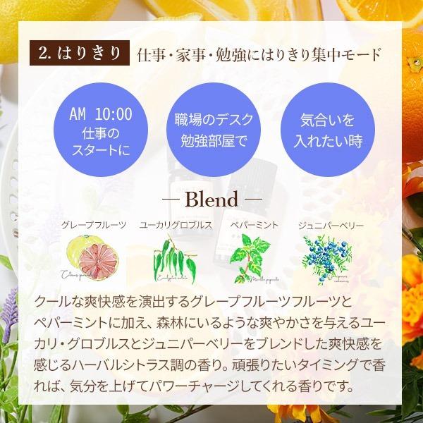 休日や仕事終わりのやすらぎ時間にぴったりなブレンドエッセンシャルオイルです。落ち着きのある柑橘系のブラッドオレンジとベルガモットFCFに、ゆらいだ気持ちを整えてくれるパルマローザ、ゼラニウム、フランキンセンスをブレンド。