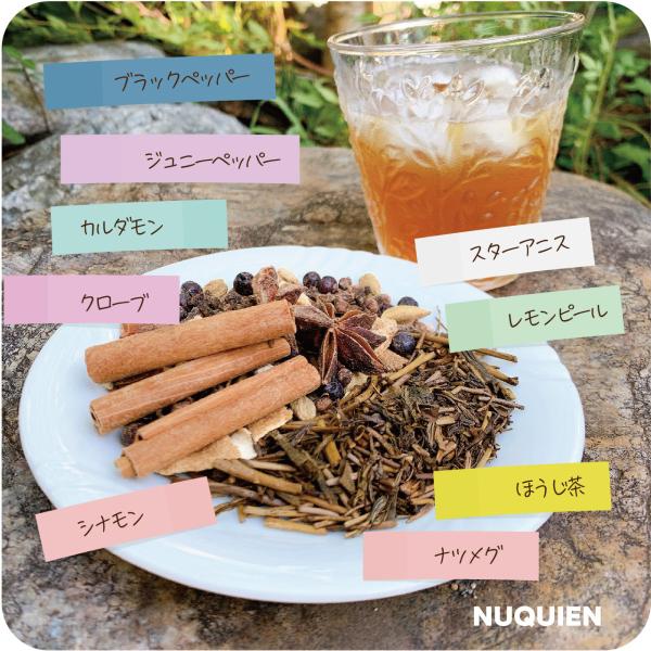 クローブ、シナモン、ほうじ茶、スターアニス、カルダモン、ジュニパーベリー、レモンピール、ブラックペッパー、ナツメグ