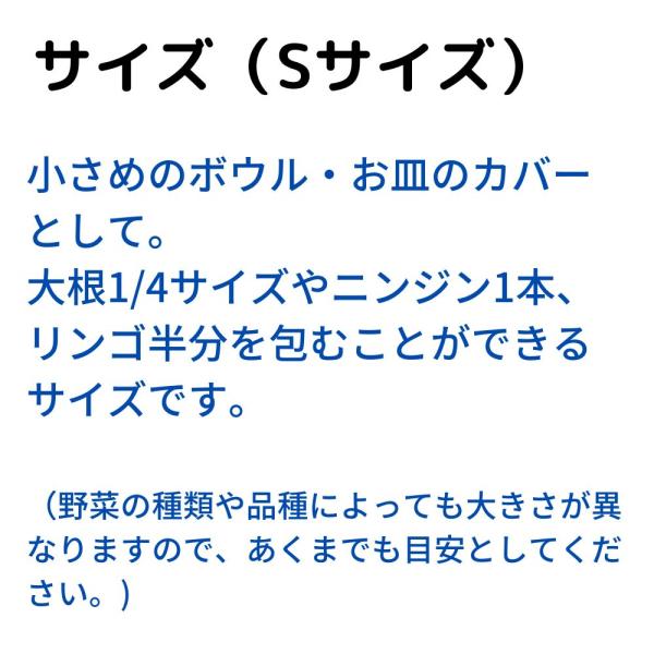 (小さめのボウルのカバーとして、大根1/4やニンジン1本、リンゴ半分を包むことができるサイズです。