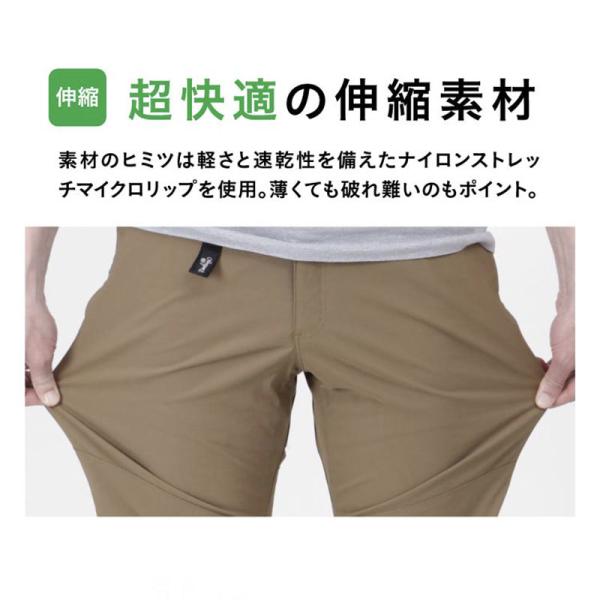 素材のヒミツは軽さと速乾性を備えたナイロンストレッチマイクロリップ。薄くても破れ難いのもポイント。