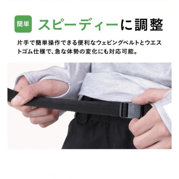 片手で簡単操作できる便利なウェビングベルトとウエストゴム仕様で、急な体勢の変化にも対応可能。