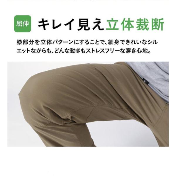 膝部分を立体パターンにすることで、細身できれいなシルエットながらも、どんな動きもストレスフリーな穿き心地。