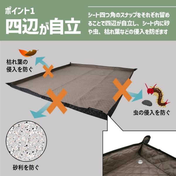 四隅のボタンを留めればフチが自立。石や砂などが入りにくい仕様。