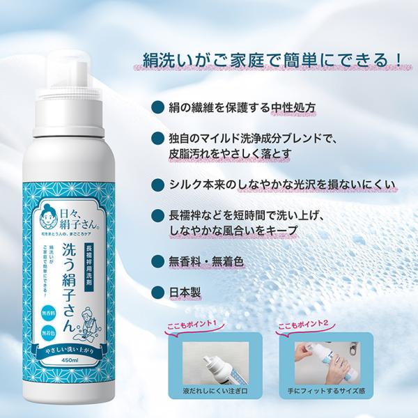 日々、絹子さん。 洗う絹子さん 450ml 長襦袢用洗濯洗剤 液体洗剤 本体 自宅 セルフケア 無香料 無着色 着物 浴衣 肌着 洗濯 シルク 絹 デリケート 日本製