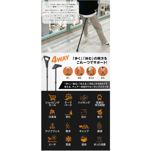 たった1秒で杖が椅子に!どこでもサッと休憩が出来る!歩く・座る・支える・休む、4WAYウォーキングステッキ疲れたらその場で座れる 椅子になる