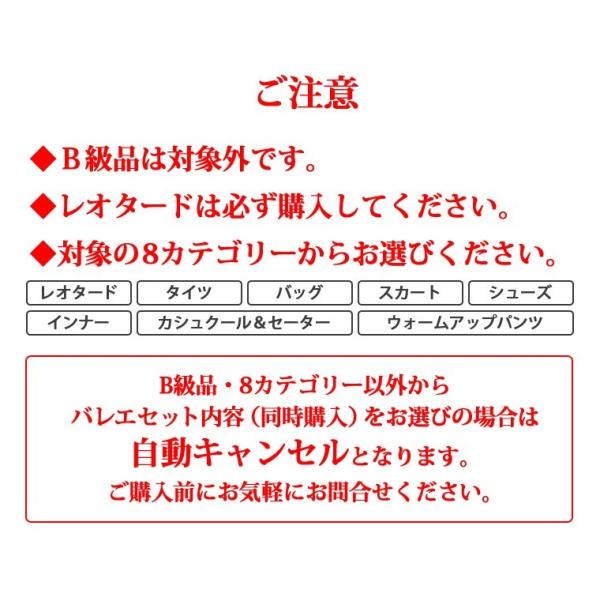 8カテゴリー(レオタード・シューズ・カシュクール&ニットセーター・バッグ・スカート・ウォームアップパンツ・タイツ・インナー)から3点とレオタード1着(必須)ご注文に対してタイツ1足が割引価格でご購入いただけます。