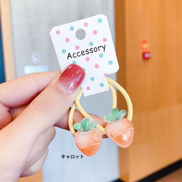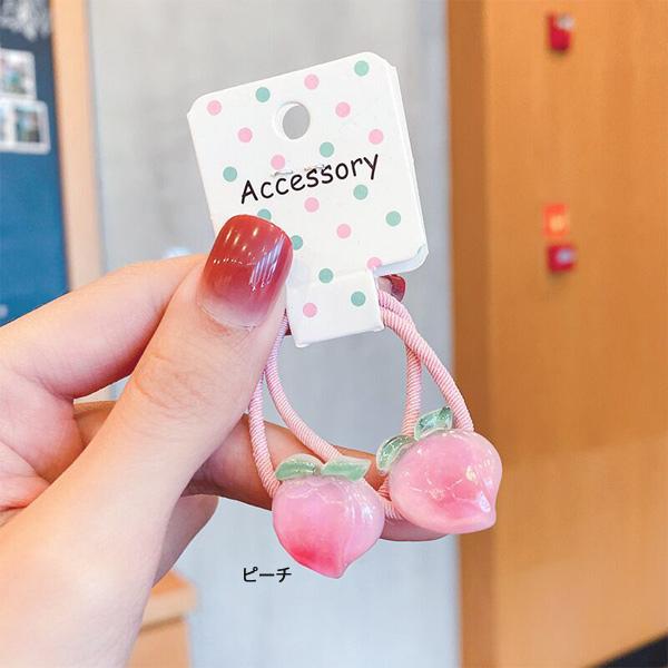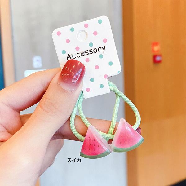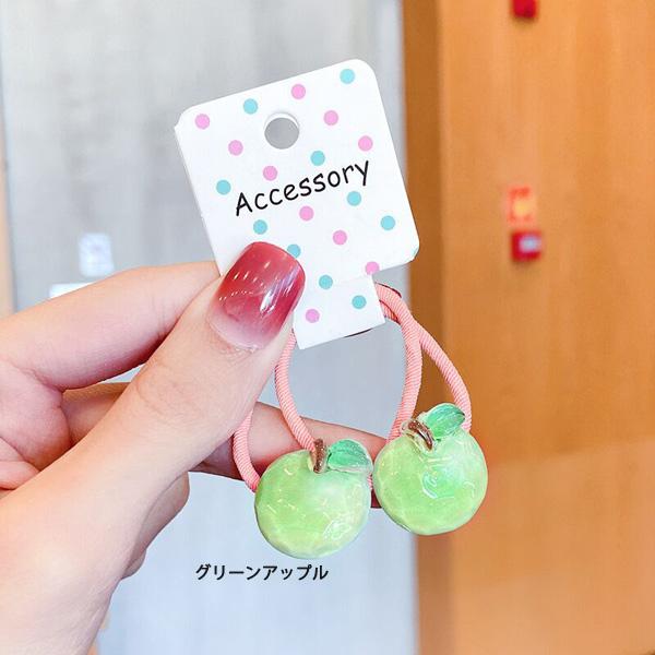 ヘアゴム2本セット グリーンアップル キャロット スイカ ピーチ チェリー モチーフ付 痛くないソフトヘアゴム