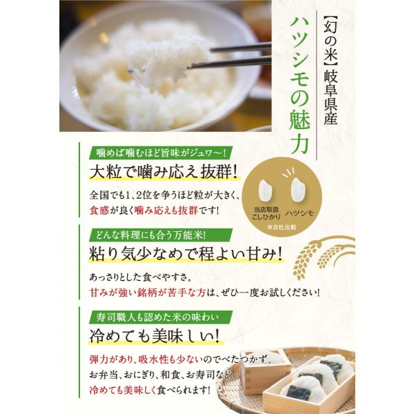 岐阜県産ハツシモです。北陸の米や岐阜の米を扱うお米屋職人が厳選して提供しています。